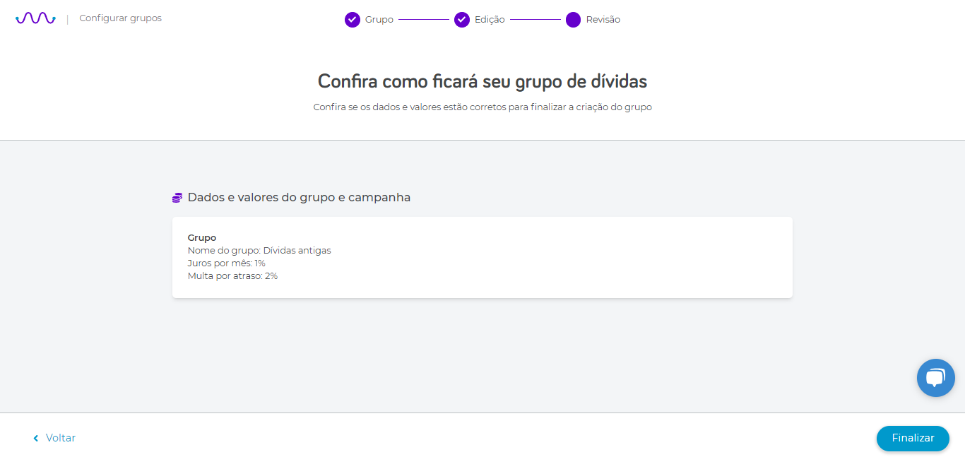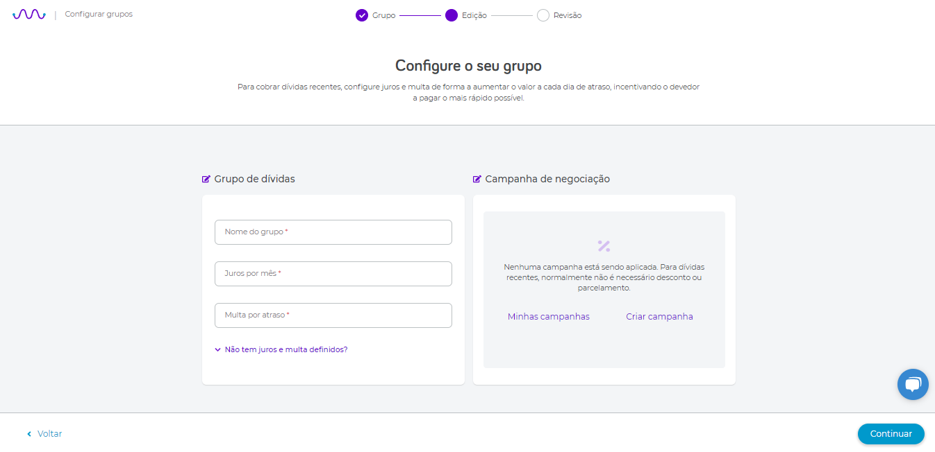- Insira o Nome do grupo desejado > Juros > Multa que irá cobrar