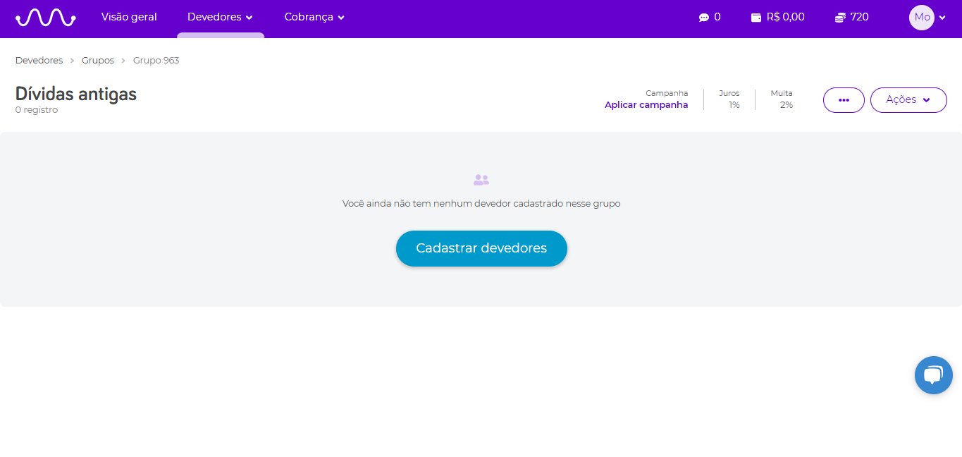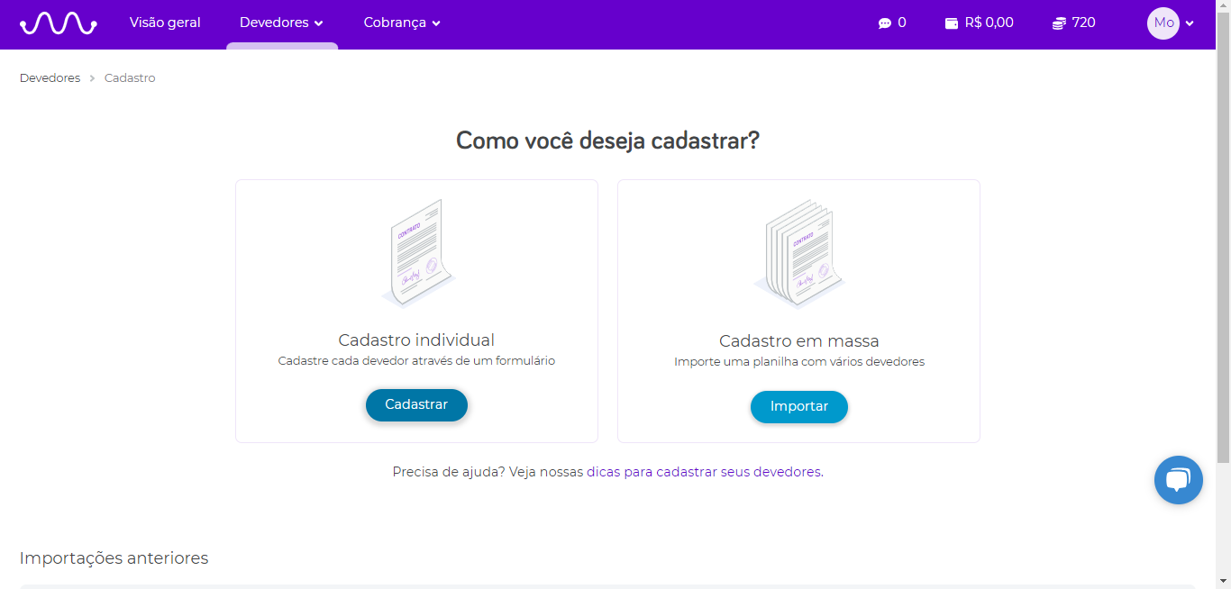 - Clique em devedores > Cadastrar devedores