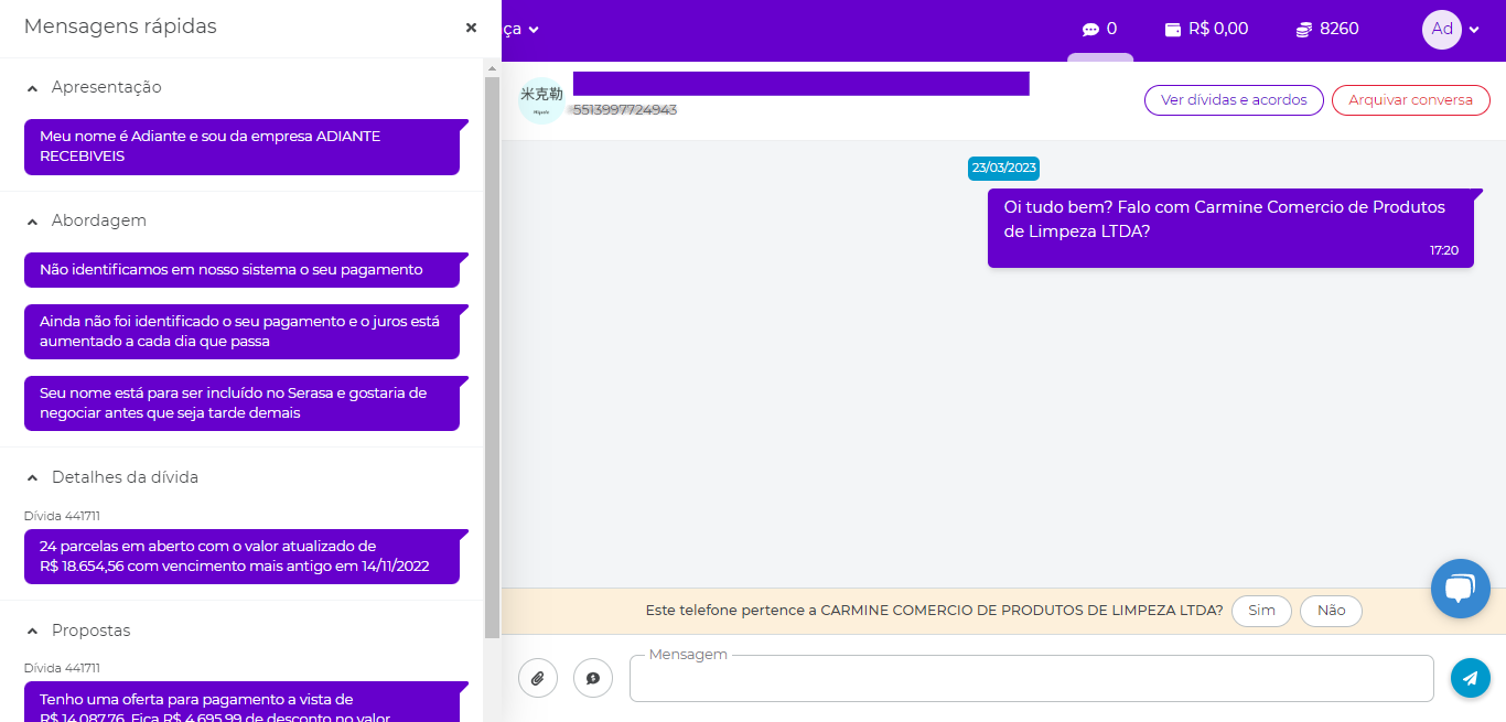 - Disparamos mensagens automáticas para conseguir o primeiro contato com os devedores e iniciar a interação com eles. Assim que eles responderem, você será notificado para continuar com a negociação